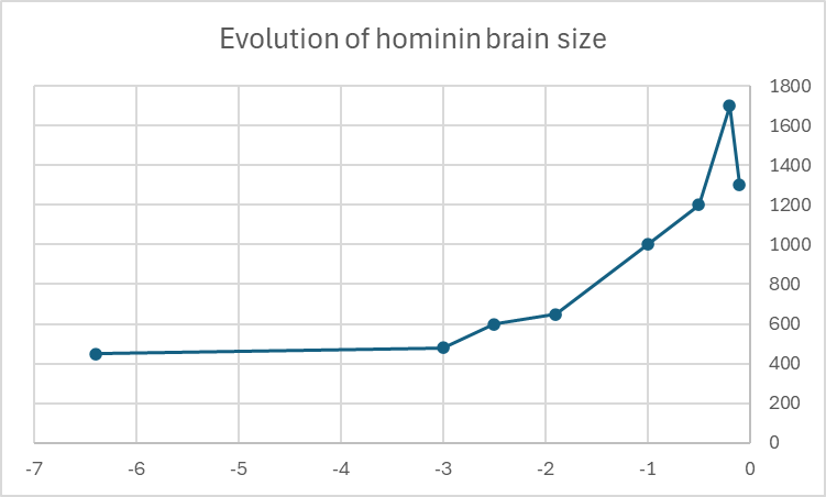 The graph plots brain size (in cc) over time, from 7 MA (million years ago) to present